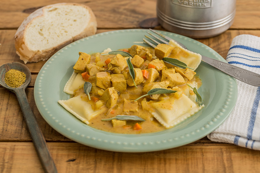 Sumar el pollo en cubos, el curry en polvo, el jugo de limón, el caldo y la crema. Cocinar por diez minutos y ligar con el almidón de maíz disuelto en agua fría.
