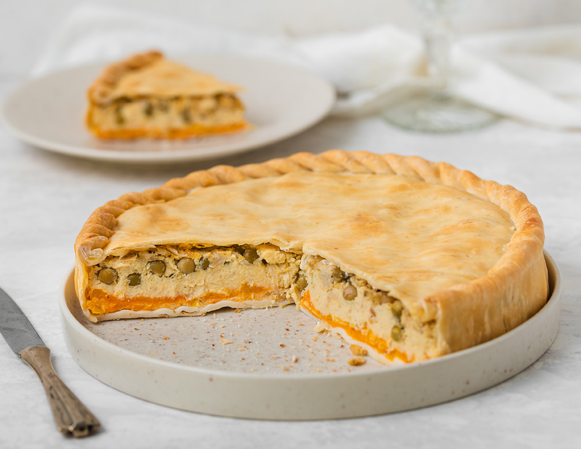 Forrar una tartera alta con una de las tapas, acomodar los calabacines en la base y volcar 1 huevo desligado. Seguido al puré condimentado de coliflor ya frio, le añadiremos otro huevo y lo colocaremos dentro de la tarta, y por ultimo las cebollas con las arvejas más 2 huevos condimentados y el queso rallado.